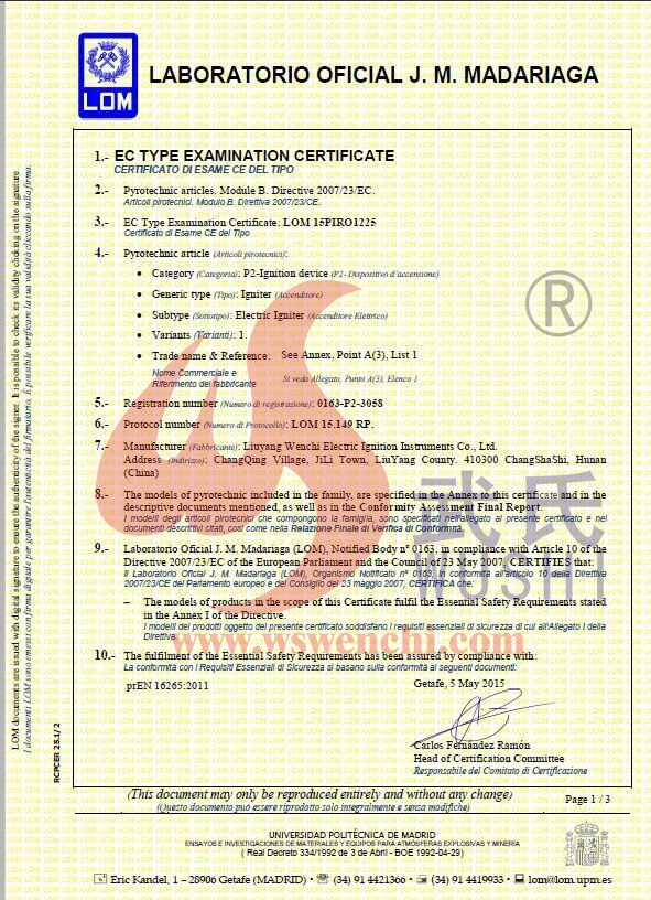 瀏陽(yáng)市文馳電點(diǎn)火具有限公司(原培文電子點(diǎn)火器材廠),創(chuàng)建于1998年,是一家專業(yè)從事研制銷售電子點(diǎn)火產(chǎn)品的民營(yíng)科技企業(yè),是我國(guó)第1枚煙花用電點(diǎn)火頭生產(chǎn)者,是《煙花爆竹電點(diǎn)火頭國(guó)標(biāo)》牽頭起草單位。公司位于中國(guó)“煙花之鄉(xiāng)”湖南省瀏陽(yáng)市,地理位置優(yōu)越,交通便利。 我公司研制的對(duì)象是用電能引燃火藥、做機(jī)械功等預(yù)定功能的一次性使用的元件或裝置,包括電點(diǎn)火頭(英文名ElectricMatch or Electric Igniter,中文俗稱“電火柴”或“電發(fā)火頭”)、電點(diǎn)火管和延期電點(diǎn)火管;我們估且在以后的產(chǎn)品技術(shù)欄中將我們研究的產(chǎn)品統(tǒng)稱為電點(diǎn)火具,將電點(diǎn)火器看成是用于提供和控制供給電點(diǎn)火元件點(diǎn)火的電能器材;我們研究的電點(diǎn)火橋路有橋絲式、無橋絲···
